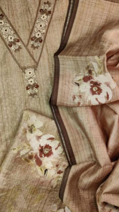 Wrapped in the richness of tussar fabric and detailed with delicate hakoba work, Mocha Majesty...