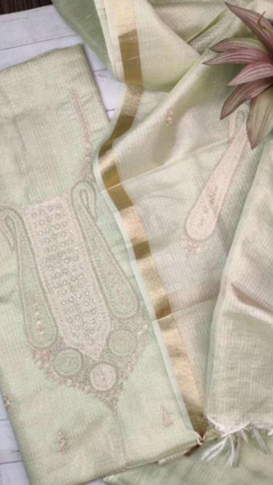 Drape yourself in timeless charm with Lunar Grace — a luxurious Banarasi linen suit set...