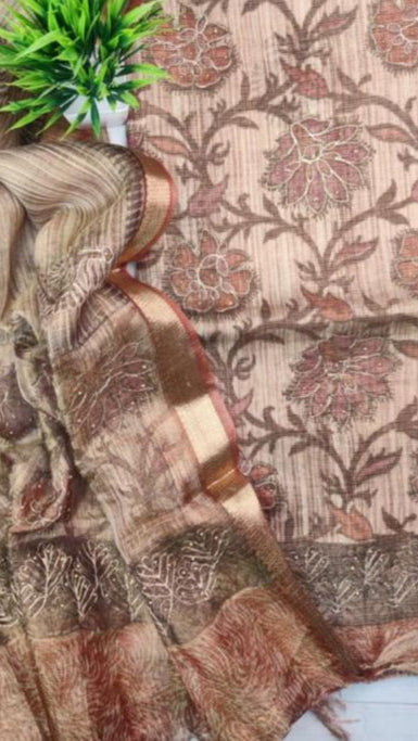 Turn heads with understated elegance in Earthy Aura – a party-perfect suit set in rich earthy brown tones, crafted from breathable kota fabric and embellished with delicate zari work. It’s the kind of outfit that glows quietly under warm lights and adds grace to every festive moment.