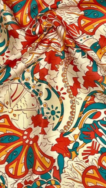 Float into elegance with Dream Drift, where artful florals bloom on a bed of ivory. Crafted from luxuriously soft modal satin, this digitally printed fabric features delicate strokes of orange and red flowers, adding a vibrant yet graceful touch to its serene base.
