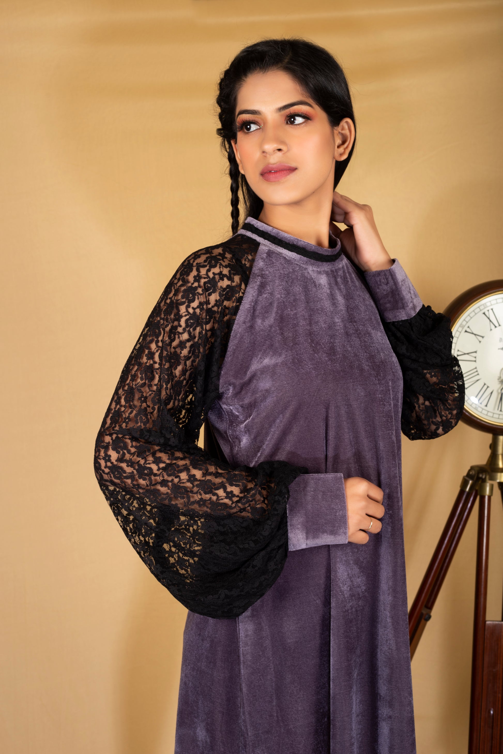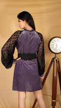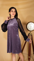 Perfect Mix of Class and Comfort. This velvet dress give you an amazing look with extravangant sleeves of lace. Flaunt it to the evening parties with a minial set of accessory and be the chik to get many heads turn in the event.