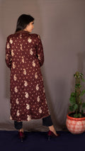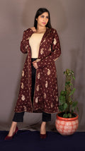 Step into the spotlight with Golden Gaze, a majestic long brocade coat in rich brown hues woven with golden intricacy. This regal layer exudes royal elegance, with every thread shimmering like stardust. Designed for festive soirées, wedding nights, or any celebration where your style needs to speak volumes — without saying a word.