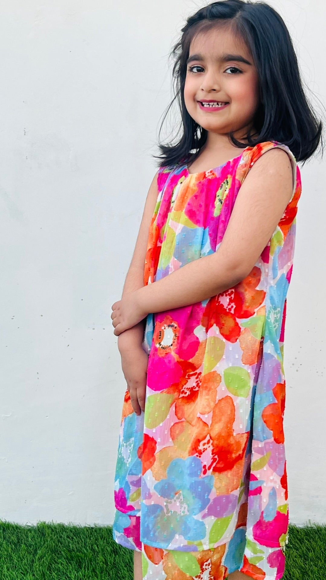 Made from soft, breathable Chiffon, Splash features a vibrant watercolor-inspired print that looks like a joyful burst of paint — bright blues, pinks, yellows, and purples blending like a dreamy rainbow.