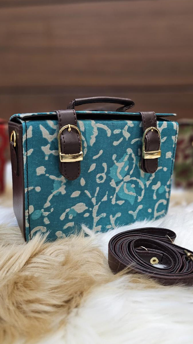 Craft meets color in the BlueMudra Box Sling — a structured beauty wrapped in the calm, captivating tones of cyan and blue. Handcrafted using traditional block printing techniques, this sling is more than just a bag — it's an expression of heritage, made modern.