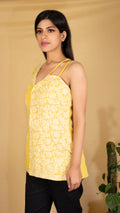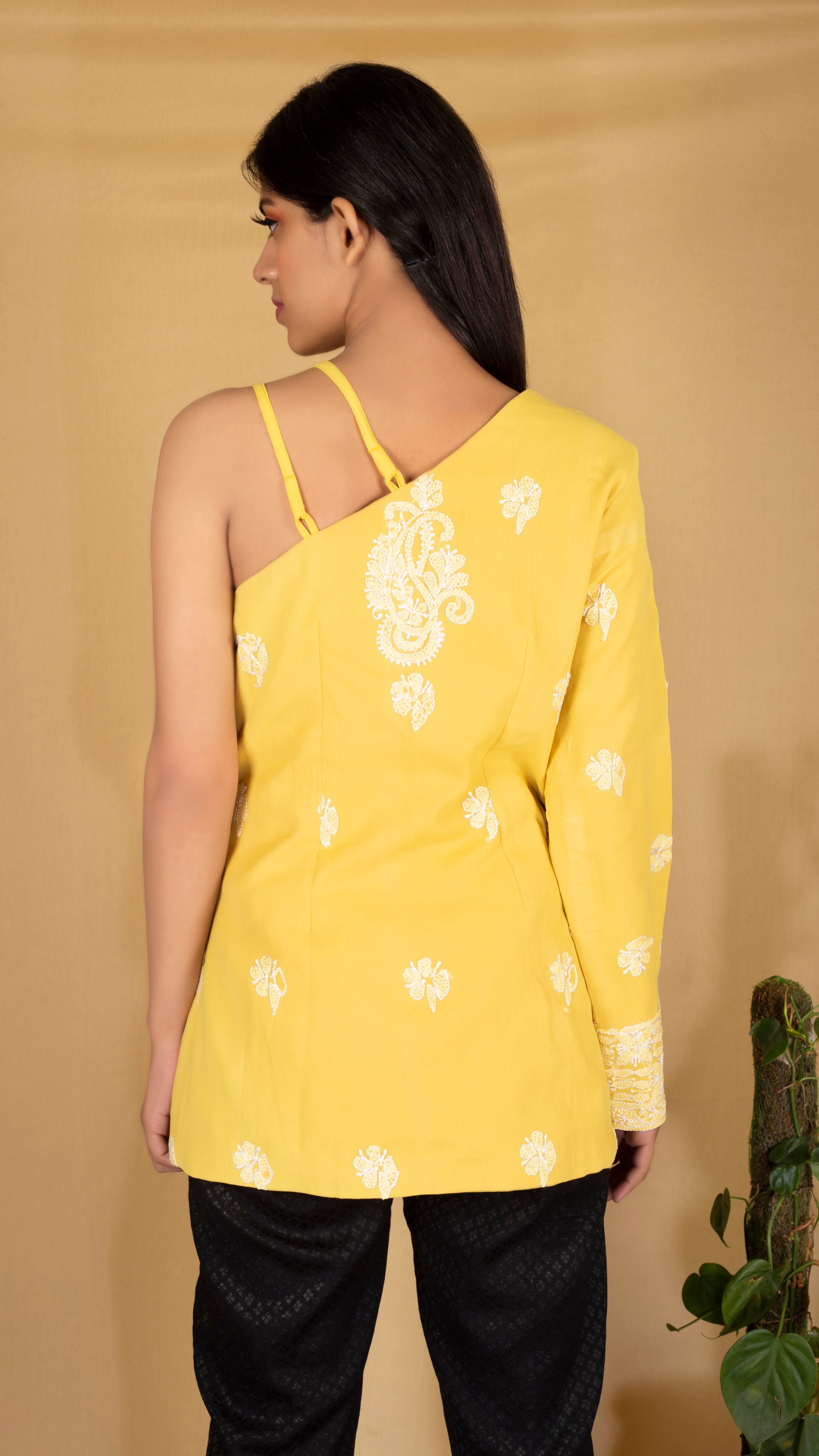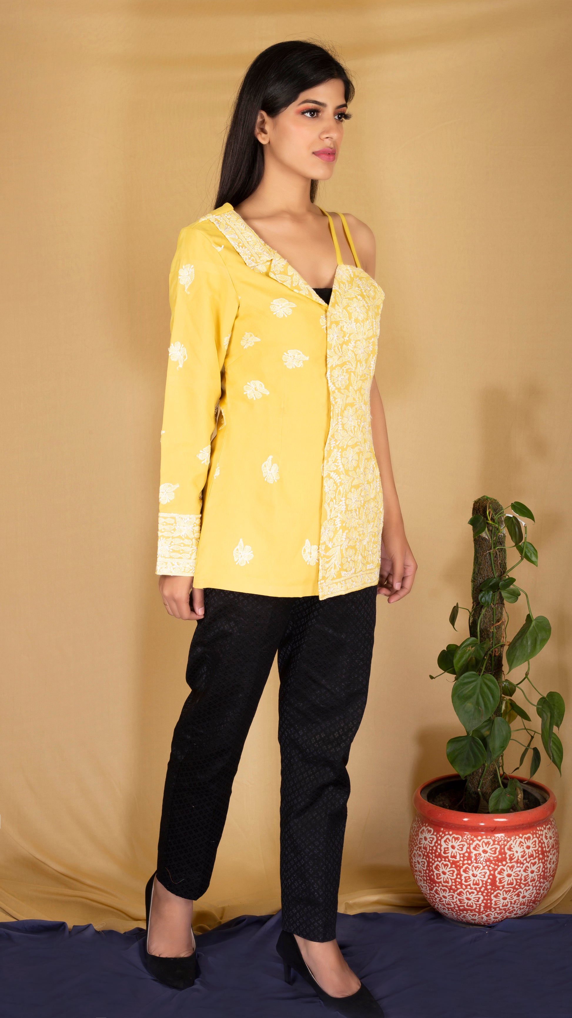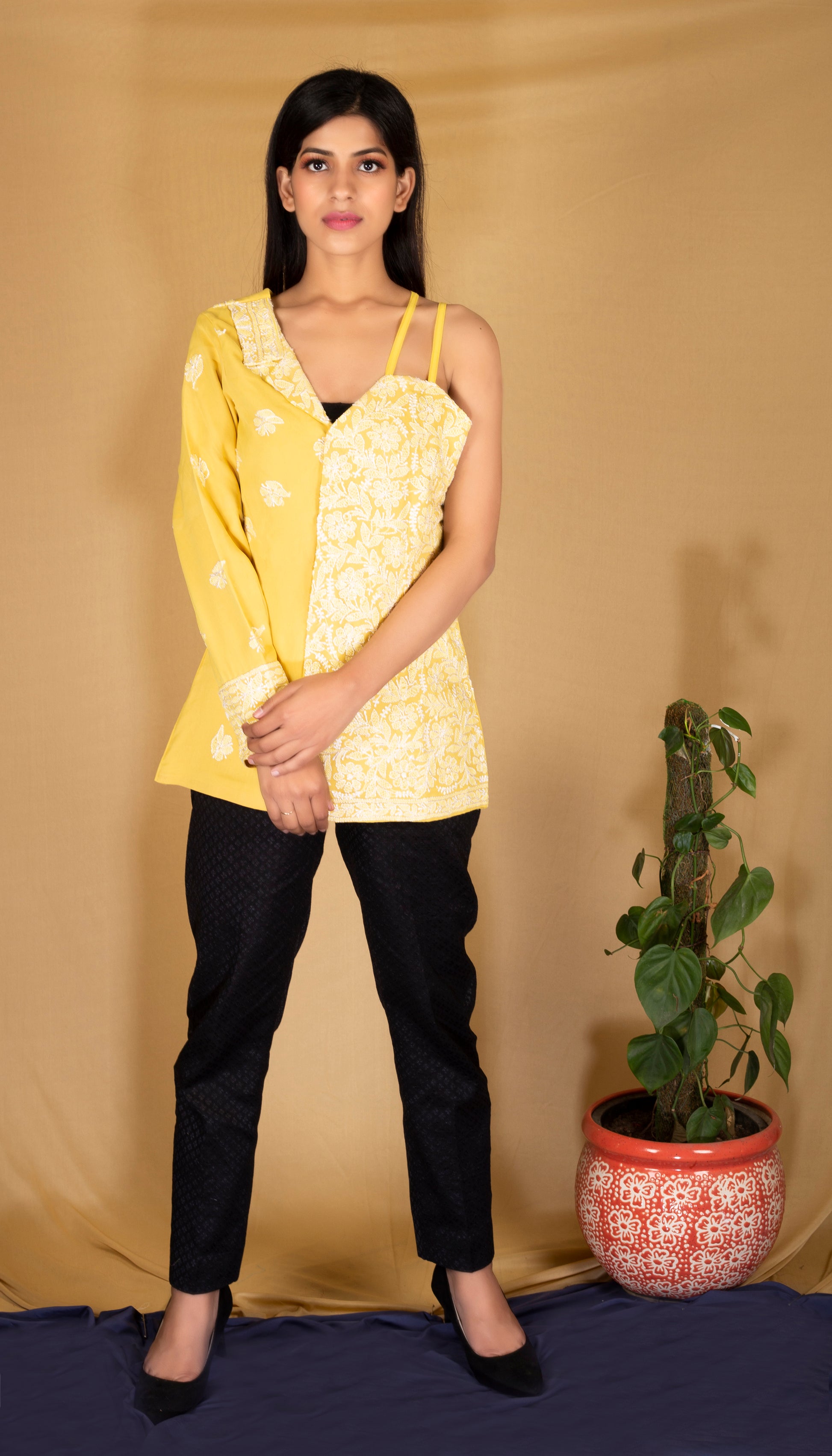 The traditional Chikankari embroidery royally fused to create a westernized affect to you day. The blazer inspired collar on one shoulder with a noodle strap on another adds on to the beauty of this piece.