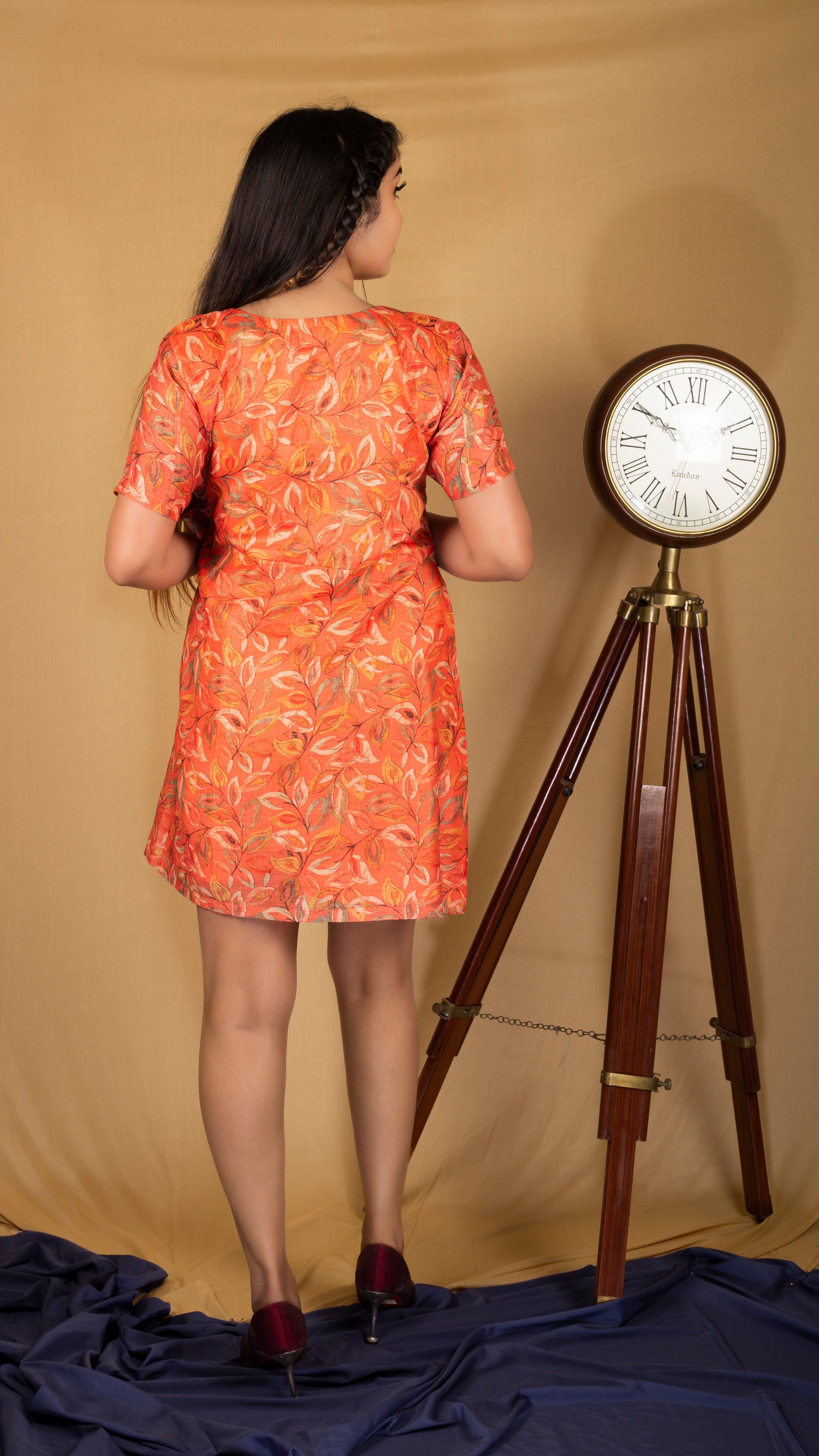 The faux wrap of this dress has the creation that needs to be created more often. The beautiful Shade of orange is perfect to fit in any occasion; day or night.